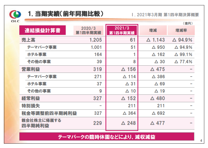 オリエンタルランド 4~6月期の連結純損益は248億円の赤字