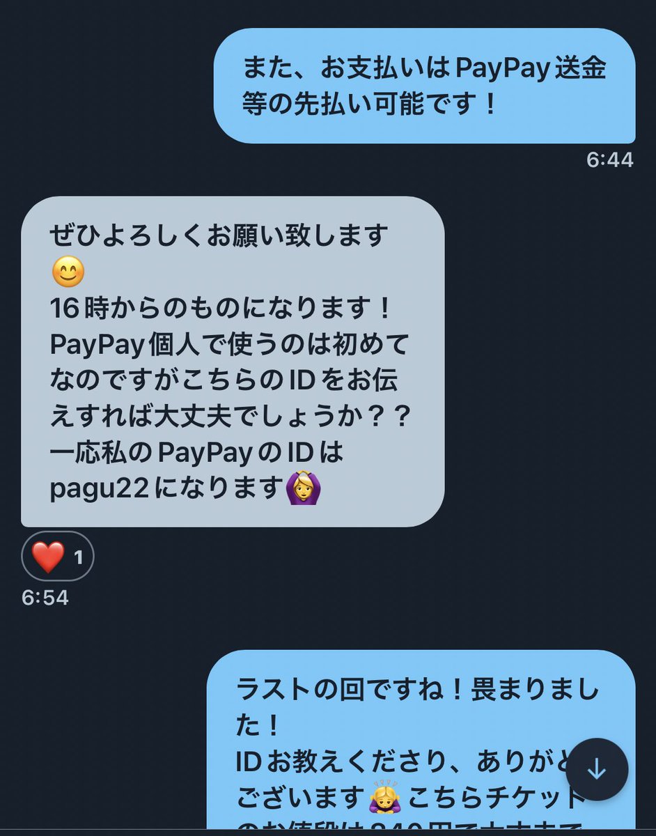 【注意喚起】 典子様(rlypiylij)とのお取引はお勧め致しません。本日ブルメロ展のチケットお譲りいただける予定でPayPayにて先払いしたところ、音信不通となりました。他界隈でも詐欺を行っているという情報も得ています。当選画面の提示を拒否され、16時回のチケットなんてないという会話→