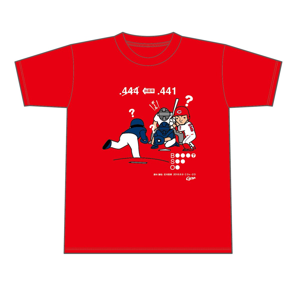 昨日の鈴木選手の打席でおきた審判のカウント間違いに関連して、球団は「幻の四球Tシャツ」発売を決定。昨日終了時点の出塁率は4割4分1厘。四球だったら、4割4分4厘だったことから、441+444の885枚限定発売だそうです。
