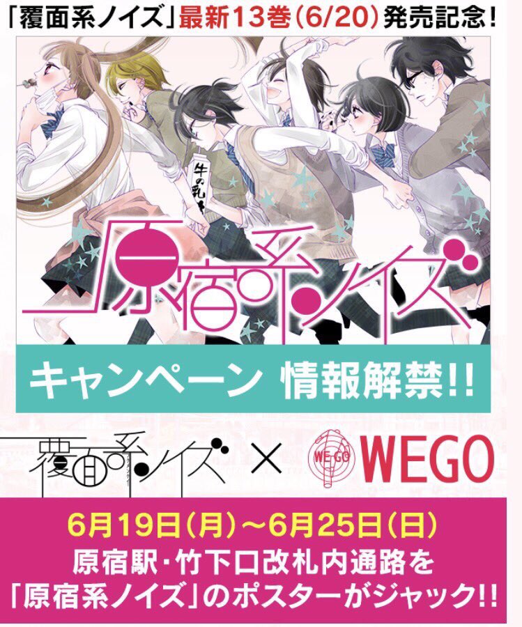 原宿のWEGO ④店舗にて「覆面系ノイズ」のコラボがスタート🔥!「ニノ」「モモ」「ユズ」の③キャラクター書き下ろしポスターと特別コーデを各店舗で展開中🕴🏻✨キャラクターと同じアイテムが購入できるので行ってみてね☁️