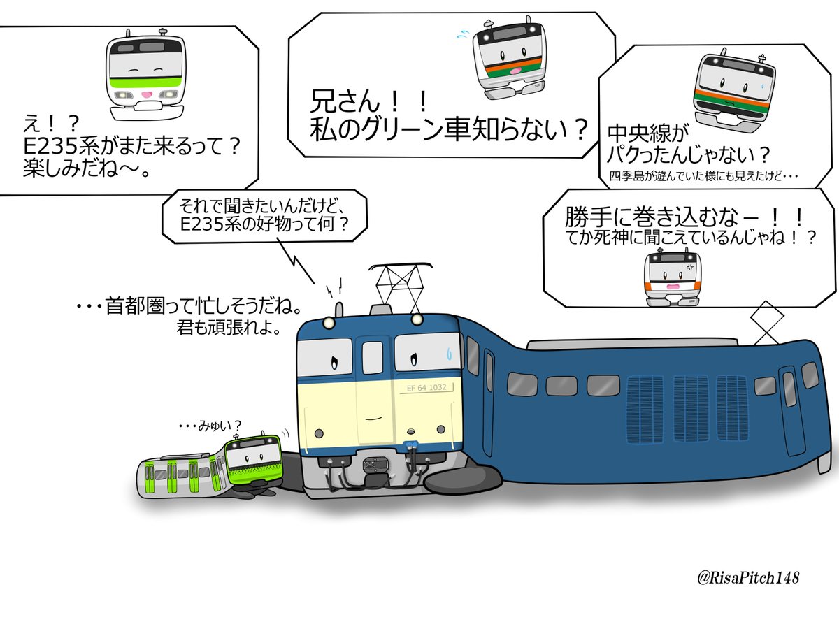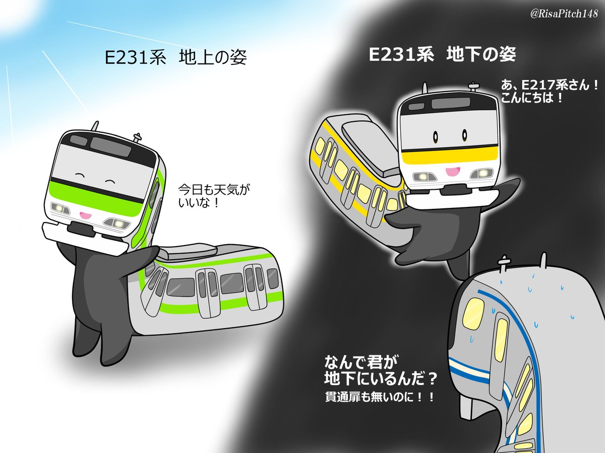 E231系500番台の帯の色は実は葉緑素の色で、地下区間を走るようになると次第に葉緑素が抜けて黄色になります。※大嘘です