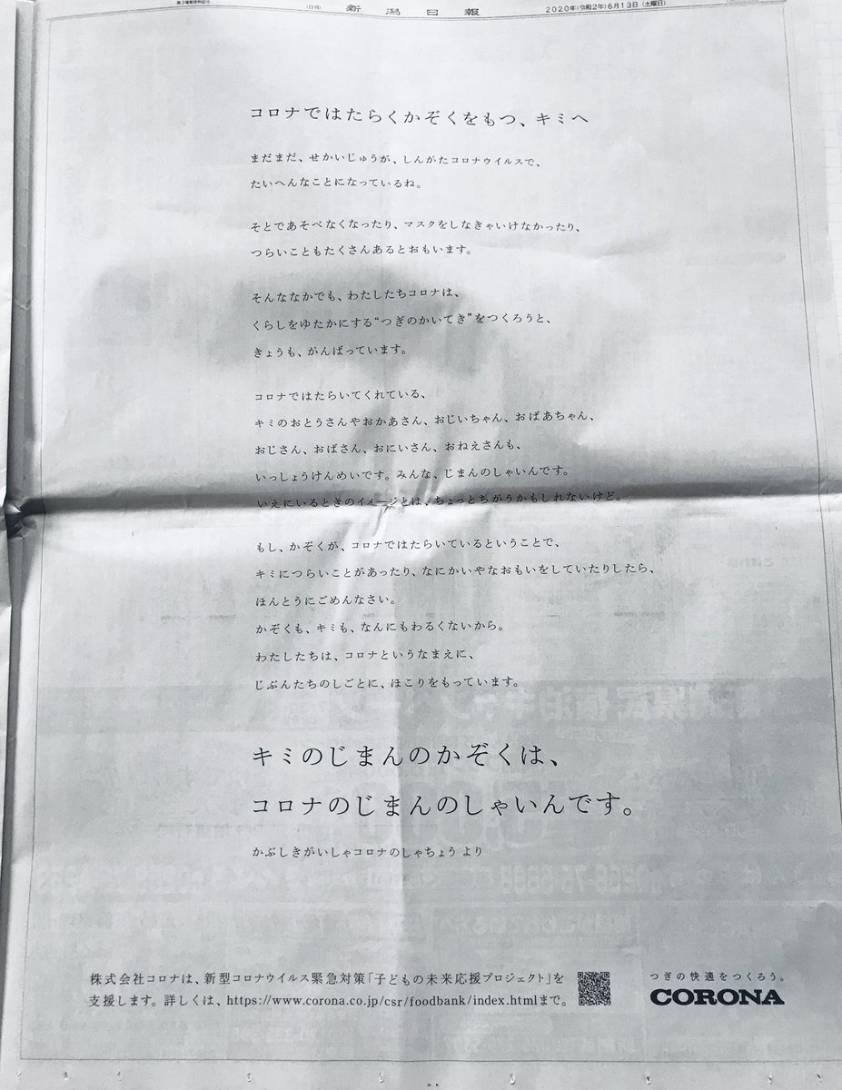 今日の新潟日報朝刊に掲載されてるCORONAで働く社員の家族向けメッセージ広告。折り目がついて見難いけど素敵な広告。「誇り持って」