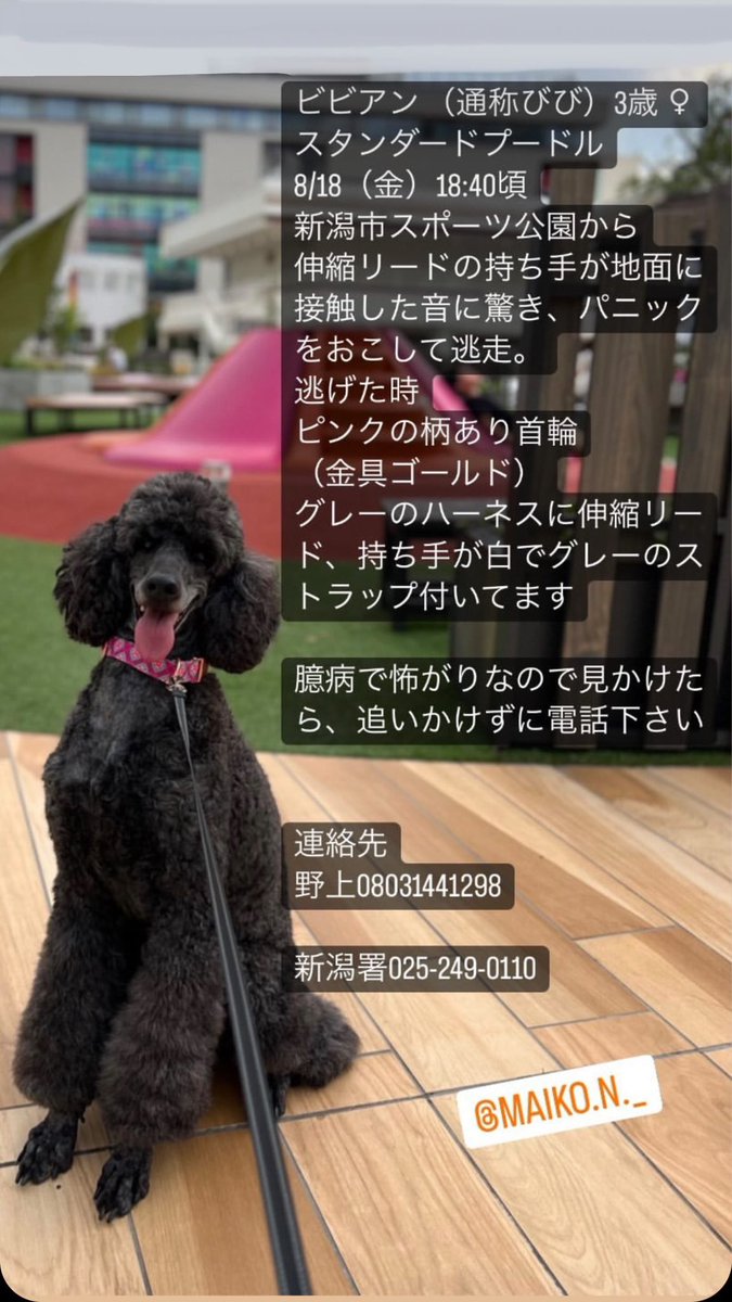 【お願い】知り合いの飼っているスタンダードプードルが18日の夕方、県スポーツ公園でお散歩中に迷子になりました。みんなで探してますが未だ見つかりません。明日はアルビの試合があります。スタジアムへ向かう道中、駐車場へ向かう途中などで見かけましたら写真の連絡先まで情報をお願いします。