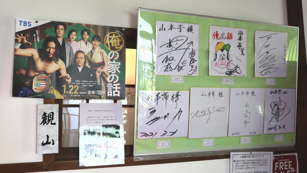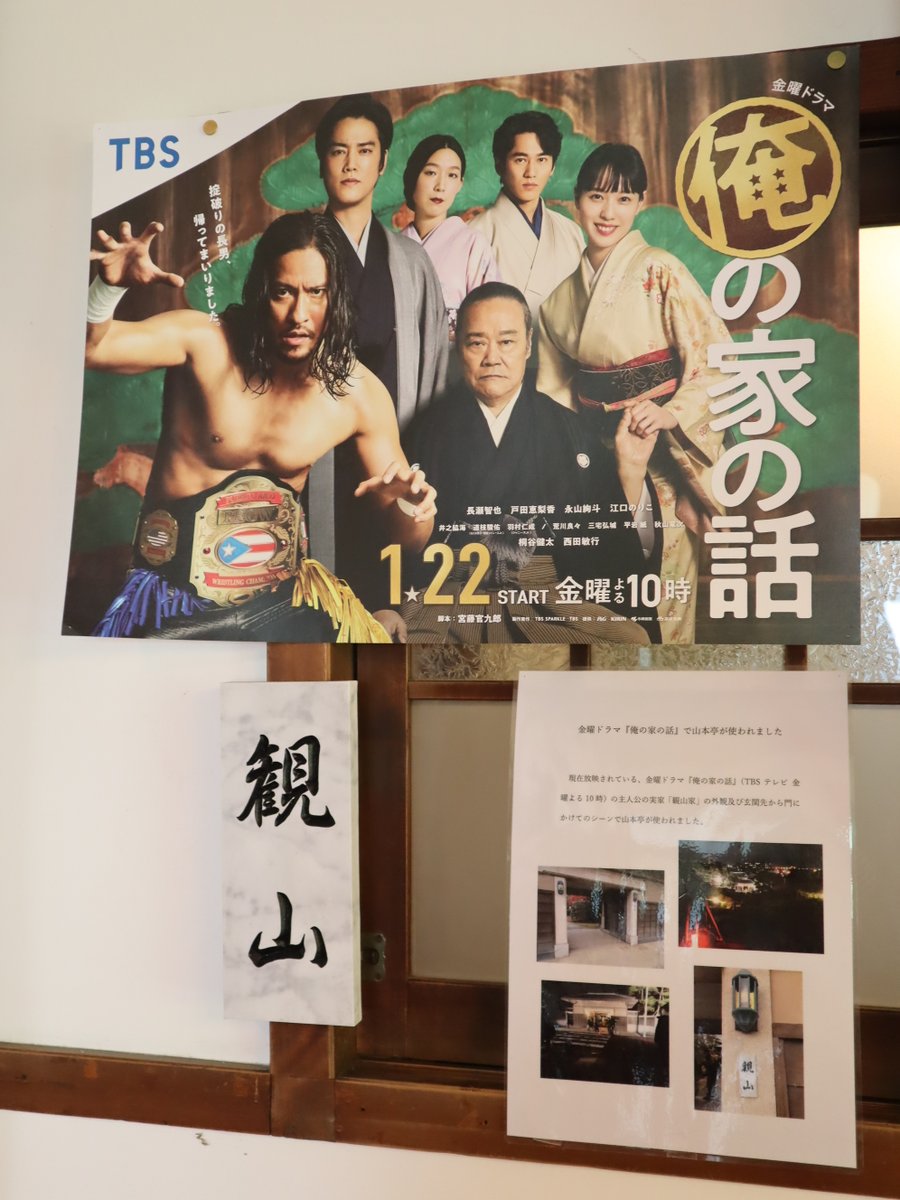 3月まで放映されていたTBSテレビの金曜ドラマ「俺の家の話」の主人公の実家「観山家」の外観、玄関先から門にかけてのシーンで山本亭が使われました☆山本亭には出演者の方のサインや、実際に使用されていた観山家の表札が飾られています(^o^)