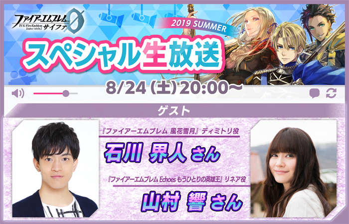 8月24日(土)に「スペシャル生放送2019SUMMER」を放送します。『風花雪月』ディミトリ役の石川界人さんをゲストにお迎えして、熱い夏を迎えるサイファの最新情報をゲストMCの山村響さんとお届けします!