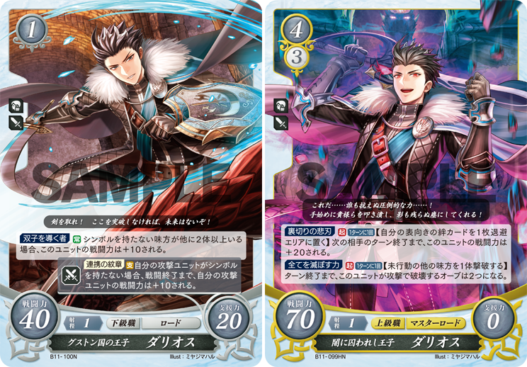 【カード紹介】グストン国の王子ダリオスは、シオン・リアンと親交が深く、兄のように慕われていた青年です。しかし、悲しき裏切りによって、その関係は終わりを迎えます。優しかった彼が何故…? その背後に忌まわしき邪竜の影が蠢きます。(Illust:ミヤジマハル) #FEcipher