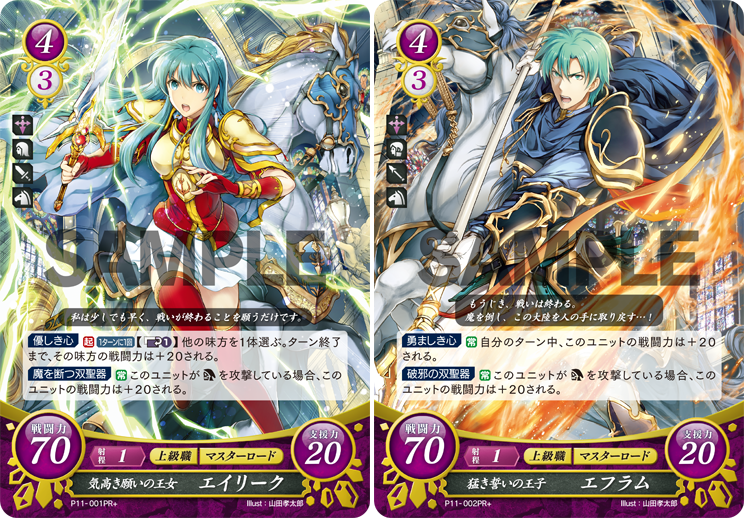 第11弾のブースターボックスには購入特典として、エイリークとエフラムの「オリジナルプロモーションカード2枚(全2種・加工違いあり)」と「非売品オリジナルスリーブ5枚(全2種)」が封入されています! #FEcipher fecipher.jp/item/11th/