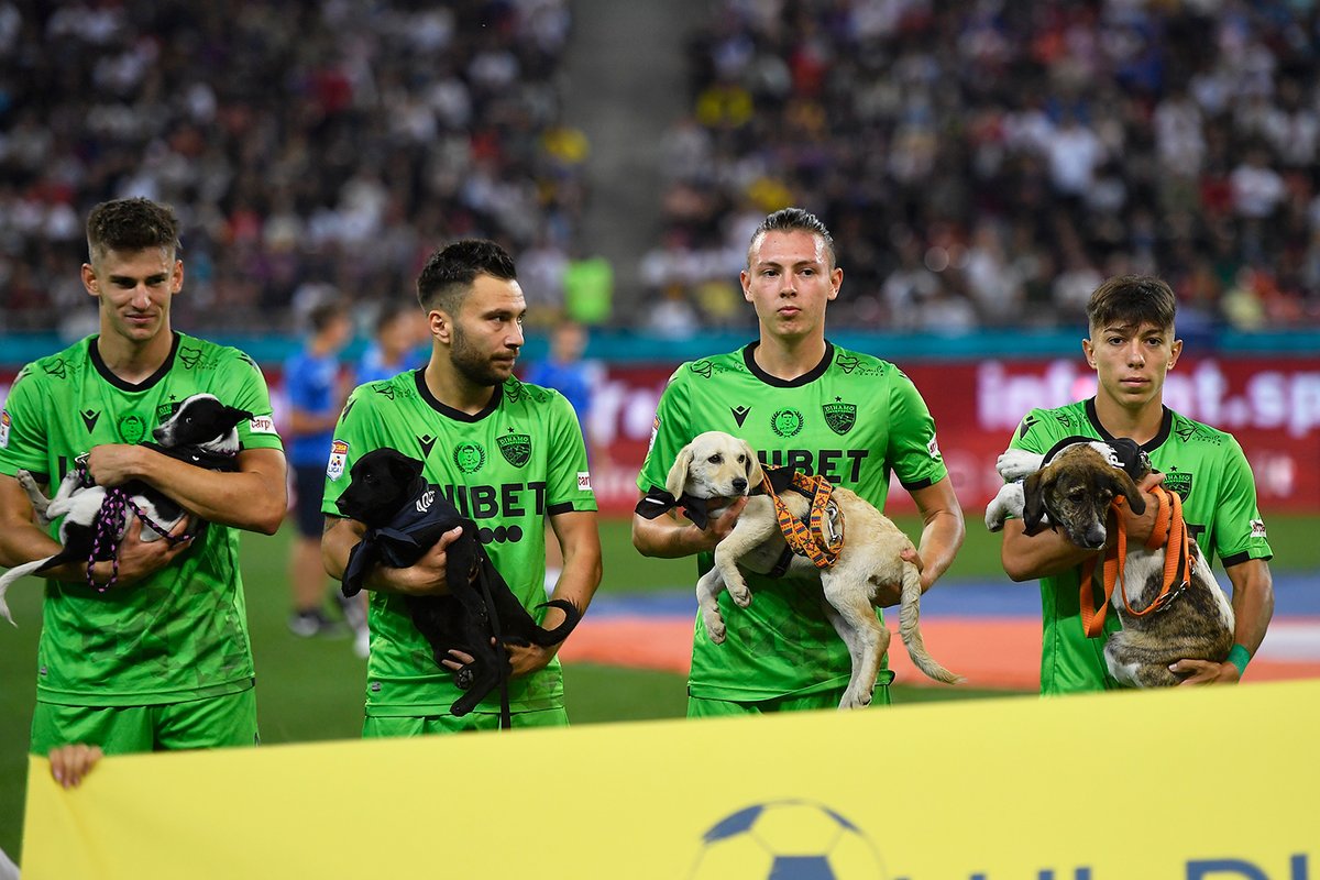 先の日曜ルーマニアのサッカーリーグと地元のシェルターが協力して犬のAdoptのため試合前に選手たちが犬を抱いて登場