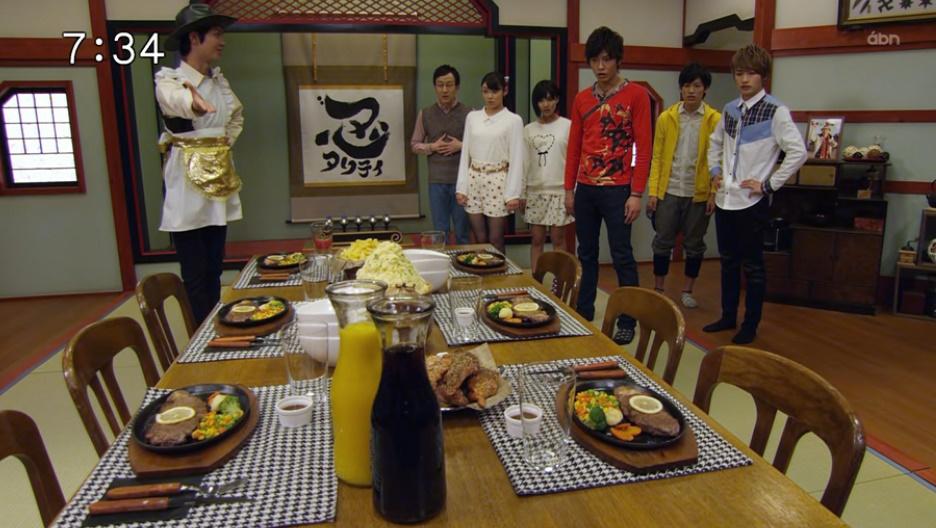 ニンニンジャーがどれぐらいやばいのかというと佐藤太郎ですら夜まで焼肉を待ったのにニンニンジャーは朝からいきなりステーキ。 この後1人がどこからともなく炊飯器取り出して白米を追加している。