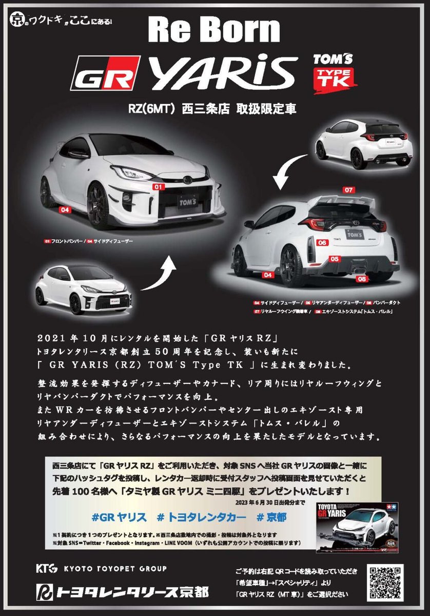 今回、トヨタレンタリース京都様にトムス仕様のレンタカーを作成頂きました。