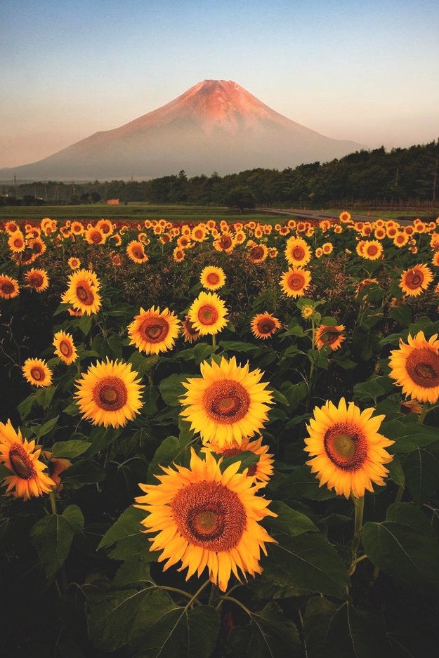 Sunflowers blooming against the backdrop of Mt. Fuji