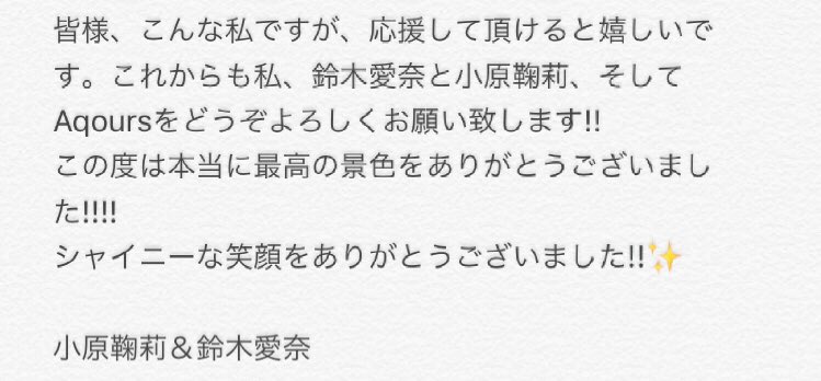 25、26日の2日間。横浜アリーナの皆様、そしてライブビューイングの皆様。私達Aqoursに会いに来て下さってありがとう!!