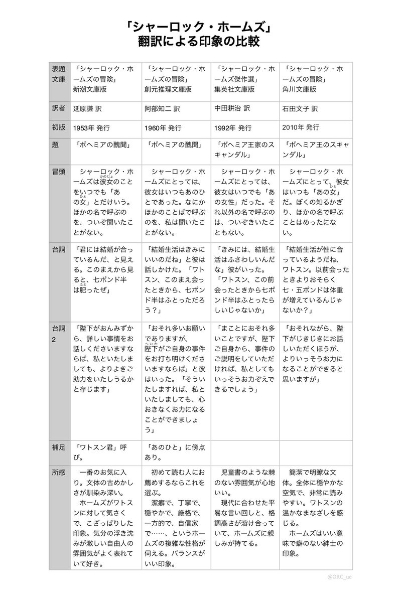 シャーロック・ホームズの話が聞きたすぎるので、とりあえず翻訳者ごとの印象をまとめました。ちょいと少ないですが比較する楽しさが伝われば幸い🎩