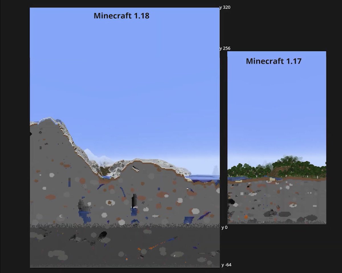 Minecraft 1.18の最初のスナップショット「1.18 Experimental 1」がリリースされました。建築高度が上下に拡張され、山岳や洞窟に新たなバイオームや地形、そして鉱脈が生成されるようになりました。また、光源レベル0の真っ暗でないと敵モブが湧かないようになりました。 twitter.com/henrikkniberg/…