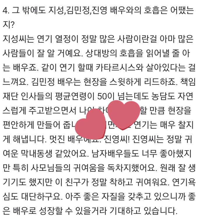 진영씨! 진영씨는 정말 귀여운 막내동생 같았어요. 남자배우들도 너무 좋아했지만 특히 사모님들의 귀여움을 독차지했어요.