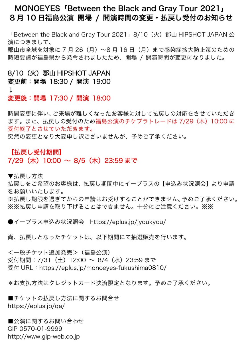 「Between the Black and Gray Tour 2021」8月10日福島公演、開場 / 開演時間の変更・払戻し受付のお知らせ