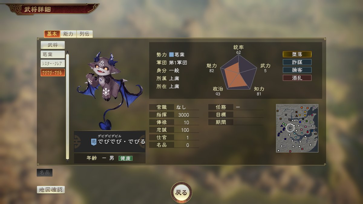 個性「堕落」は敵の士気が低下しやすくなり、次ターンさらに低下。戦法「魔の巧言」は範囲内の敵の攻軍がダウン、足止を付与。