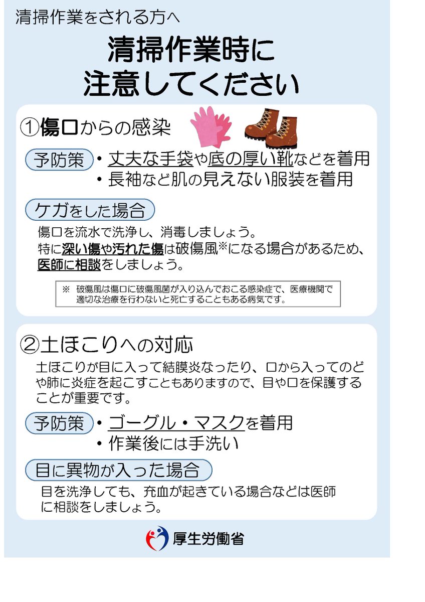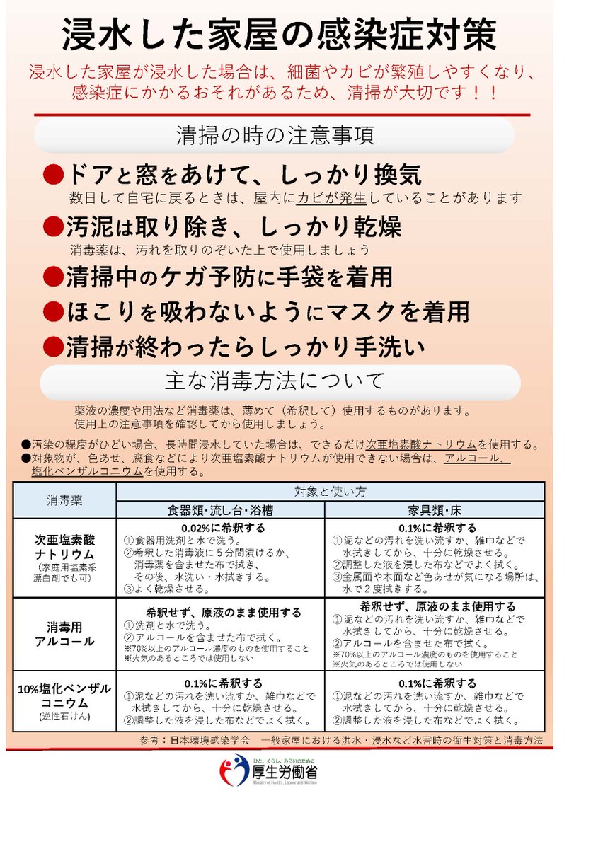 【浸水した家屋の消毒について】浸水した家屋の感染症拡大のリスクを防ぐため、浸水した場合は衛生対策を行ってください。浸水した所の洗浄や拭き取りにより十分に汚れを除去して、乾燥させた後、消毒をするようにしてください。⇒city.sano.lg.jp/topics/info/in…