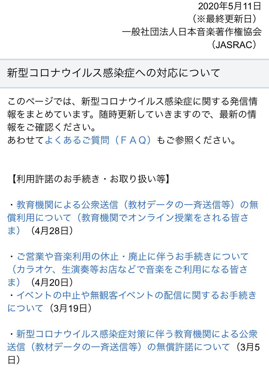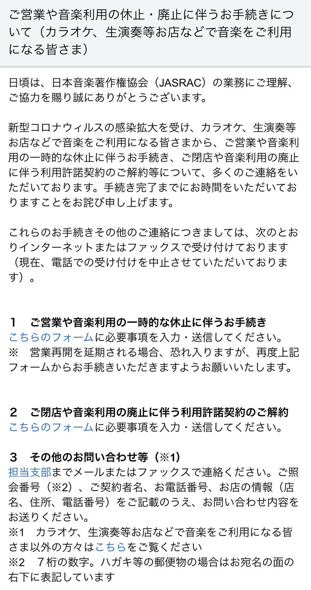 飲食店や旅館などで、JASRACと契約しているけどお店を閉めている、音楽利用を休止している、というような方は利用許諾契約の解約等出来るようですので、jasrac.or.jp/smt/news/20/20…こちらから手続き方法等ご確認下さいませ。