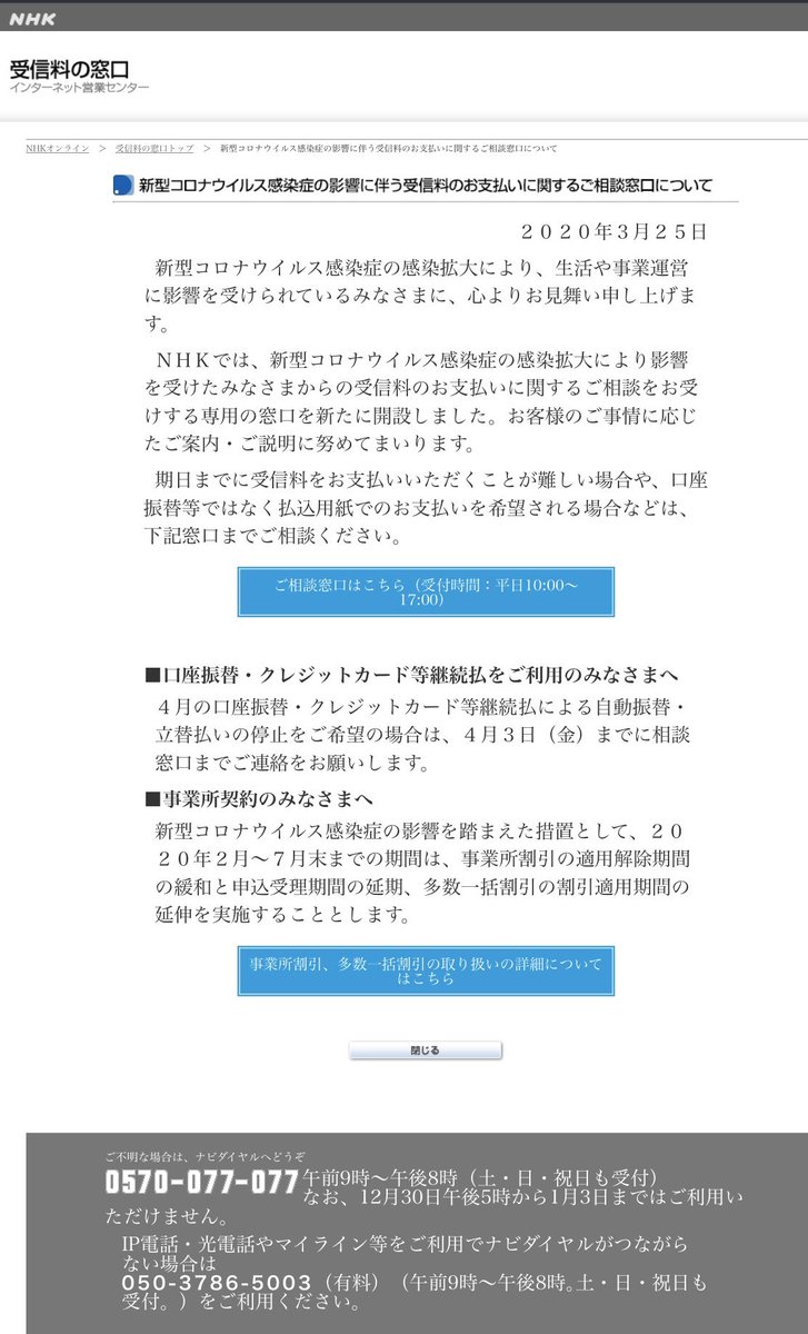 一切見てなくてもテレビ設置してるだけで支払わねばならぬと言われるNHK受信料。以前も呟きましたが、テレビをお持ちの方でコロナの影響でNHKの受信料が厳しい方、旅館ホテルさん、支払いに関する相談は以下サイトで出来ます。pid.nhk.or.jp/jushinryo/coro…個人的にはこれを機に脱テレビを推しますが…。