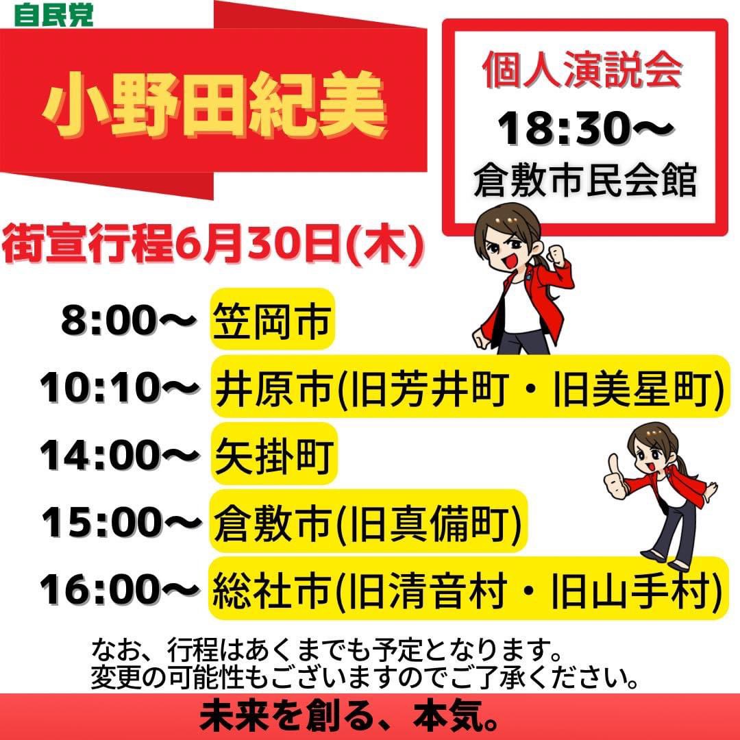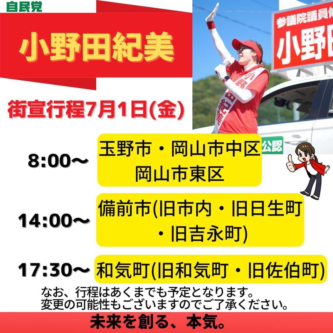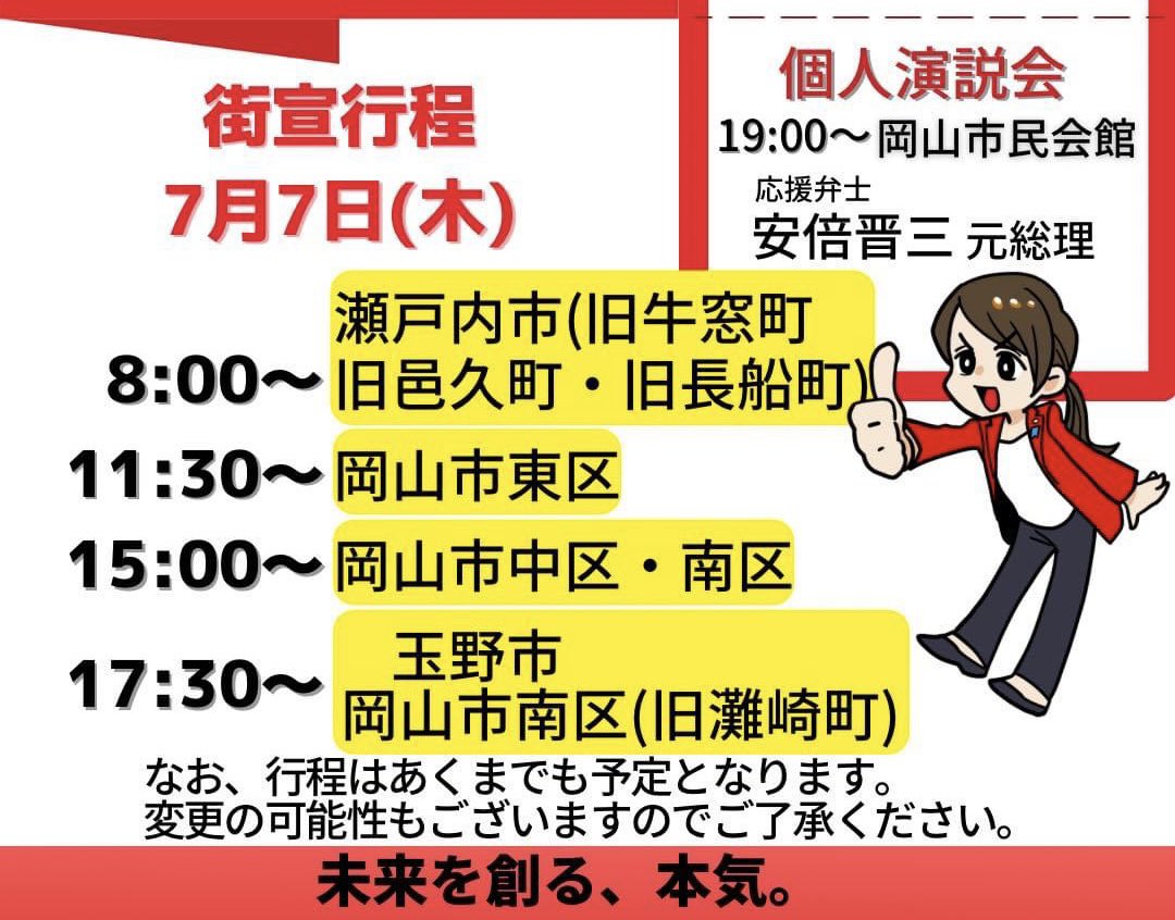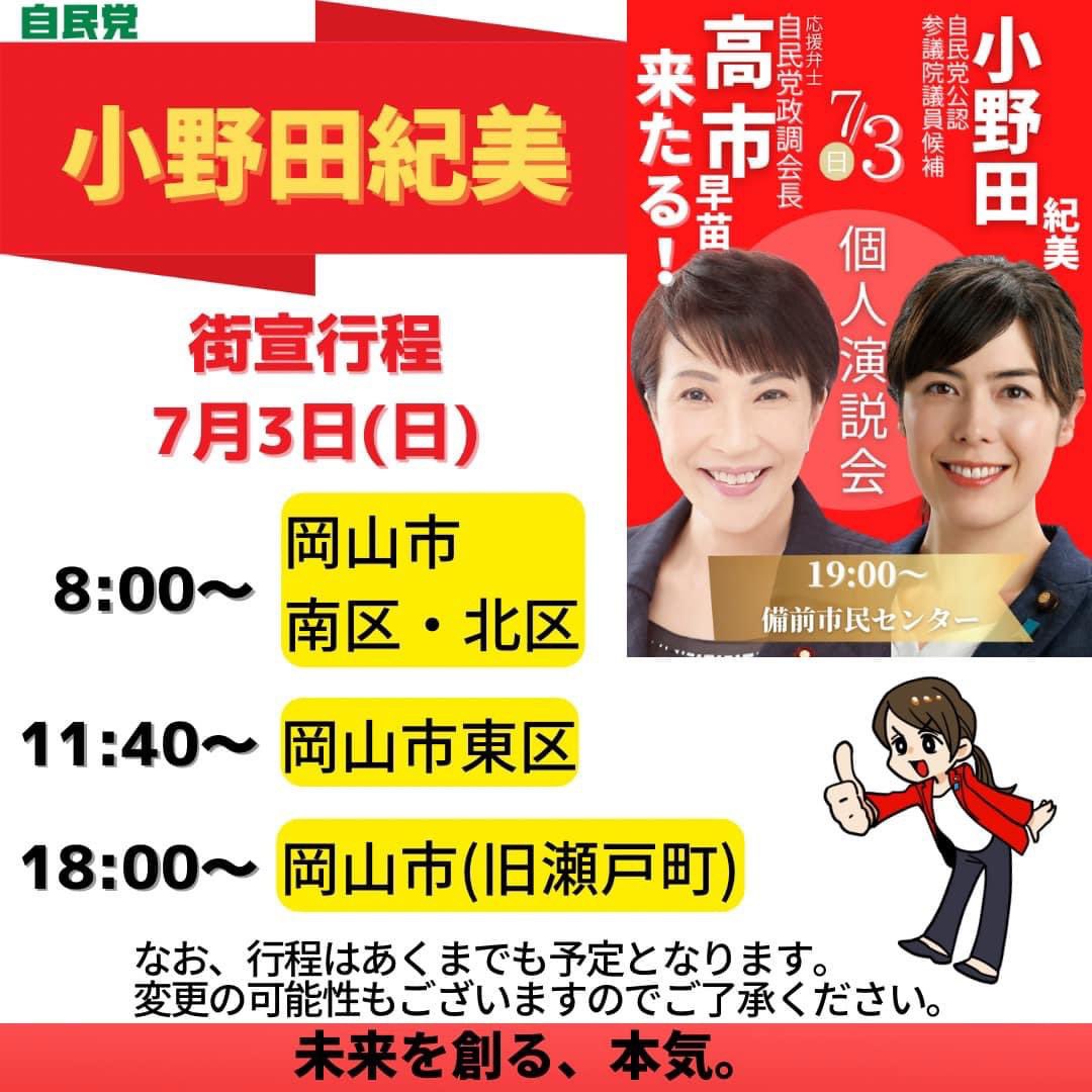 7月7日(木)19:00〜岡山市民会館にて小野田紀美個人演説会ゲスト。事前登録など不要ですのでぜひ皆様いらして下さい!!