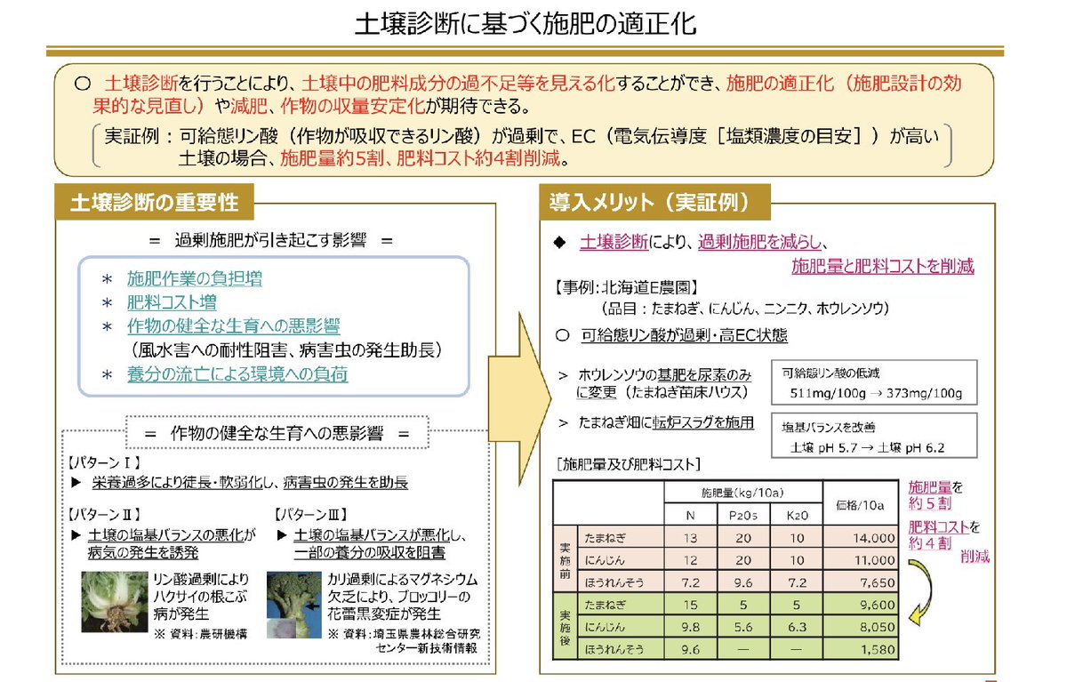 土壌中の肥料成分の過不足を見える化する事で、施肥の適正化や減肥、作物の収量安定化が期待できます。