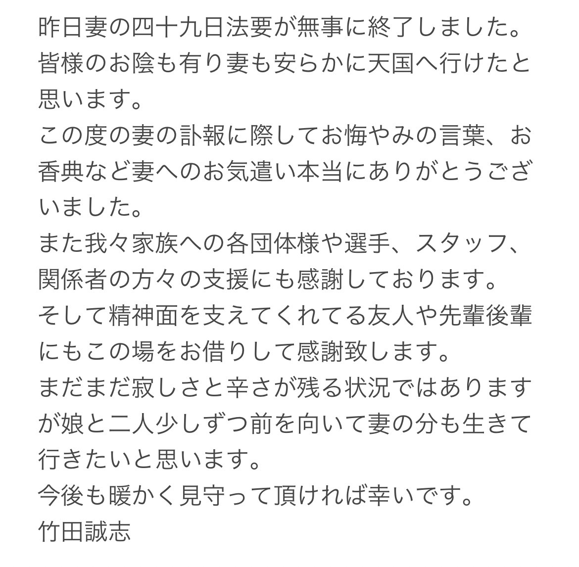 皆さん暖かいお言葉本当にありがとうございます。ここからは自宅で絶対安静の日々が続きそこからリハビリなどに入るかと思います。まだ復帰の目処はたちませんが復帰すると決めたからには前を進むしかありません。乗り越えて心と身体を万全にし皆様の前に帰りたいです。