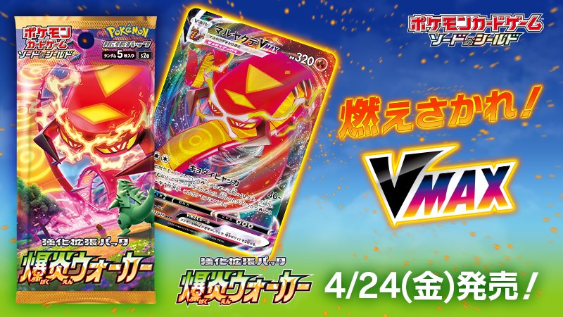 4月24日(金)にポケモンカードの新商品、強化拡張パック「爆炎ウォーカー」が発売決定! 使うほどに威力のあがるワザ「キョダイヒャッカ」を持つマルヤクデVMAXが、キミを勝利に導くよ! ぜひ手に入れてその強さを体感してね! pokemon-card.com/products/s/s2a… #ポケカ
