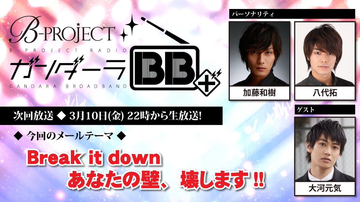 【RADIO】3/10(金)22時~放送!Bプロラジオ『ガンダーラBB+ #19』加藤さん、八代さん、そしてゲストに大河さんを迎えてお贈りします!メールテーマは『Break it down あなたの壁、壊します!』宛先は⇒ch.nicovideo.jp/loveart/blomag… #Bプロ