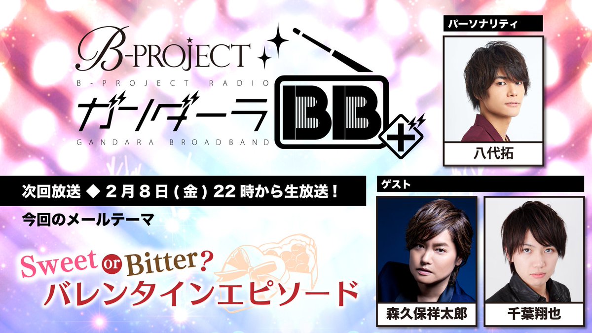 【RADIO】Bプロラジオ「ガンダーラBB+」今週末2/8(金)22時〜放送!パーソナリティ八代さん、ゲストに森久保さん&千葉さんをお招きしてお送りします♬メールテーマは『バレンタインエピソード』甘い話、ほろ苦い話なんでもお待ちしてます♪Qプロへのお悩みメールも大募集!ch.nicovideo.jp/loveart/blomag…