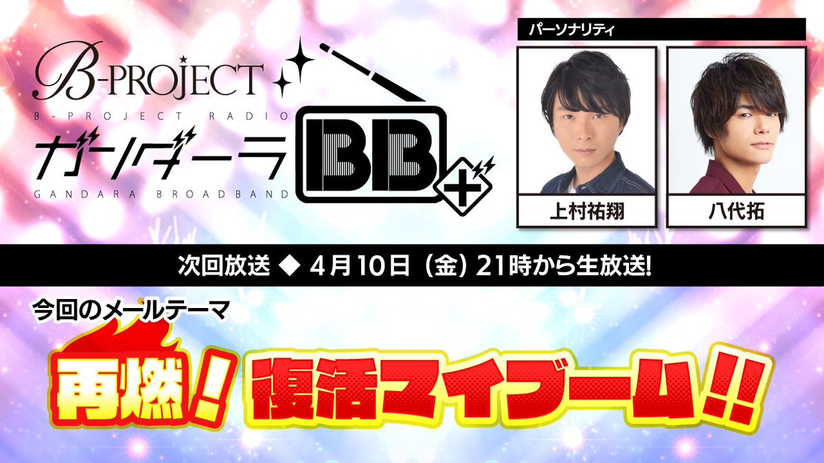 【RADIO】B-PROJECTラジオ「ガンダーラBB+」明日4/10(金)の放送は通常より1時間早く21時から八代さん&上村さんペアでお送りします。メールテーマは『再燃!復活マイブーム』