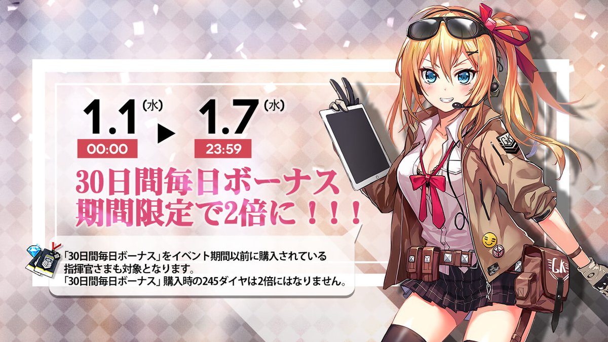 「1月1日(水)0時 ~1月7日(火)23時59分」の期間中、30日間毎日ボーナスにて日々獲得可能なダイヤが2倍になりますよ!