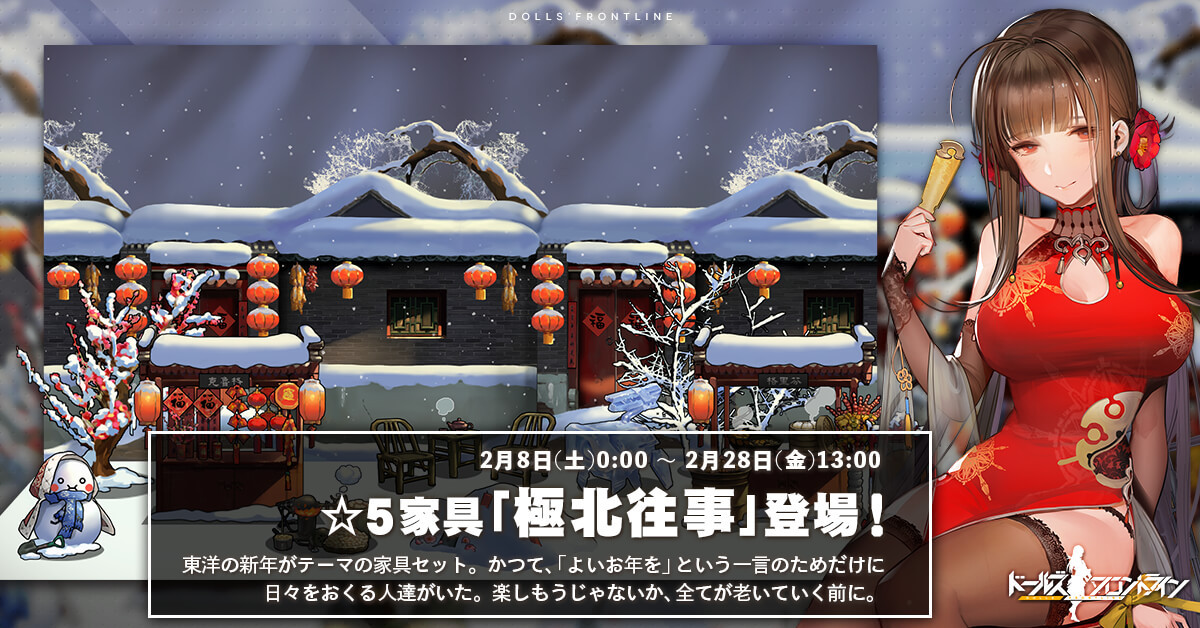 春節らしい赤い提灯と雪に飾られた家具セットです。