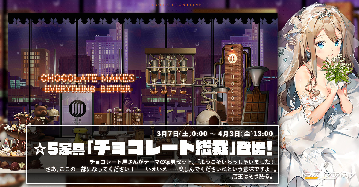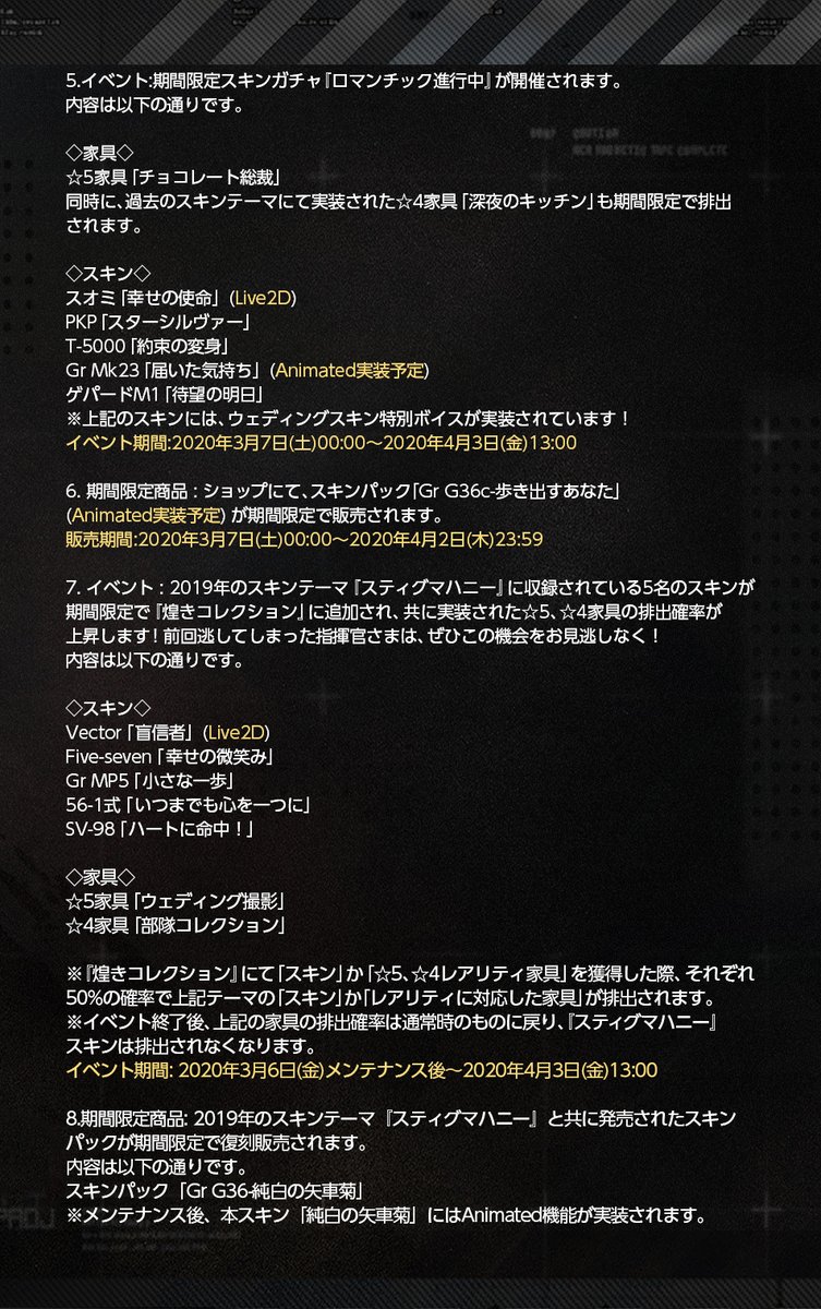 「3月7日(土)0:00」より開催する期間限定スキンテーマ『ロマンチック進行中』のスキンガチャにて入手可能です。