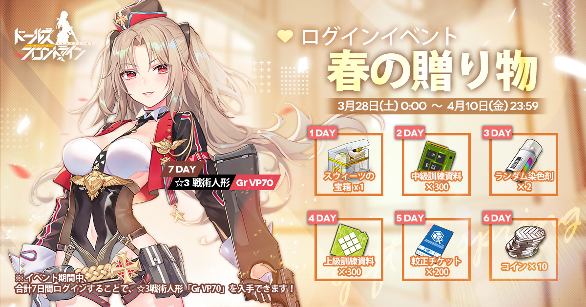 期間中はログイン日数に応じてプレゼントが配られ、累計7日間ログインすることで新人形の☆3HG「Gr VP70」が貰えます!