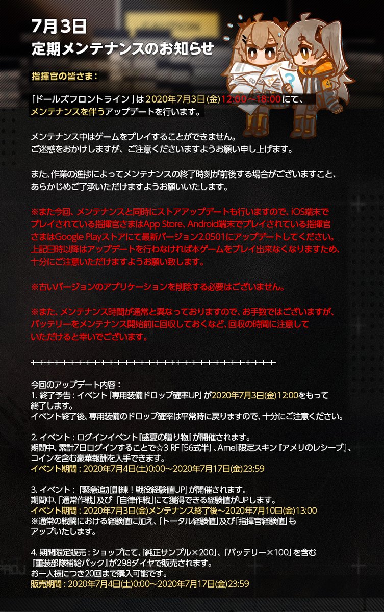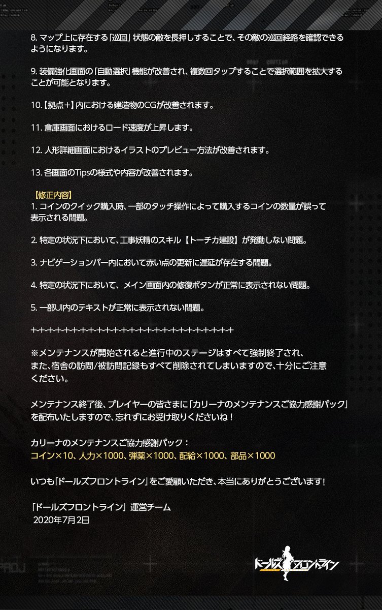 メンテナンス終了後、指揮官の皆さまに「資源4種×2000、コイン×20」を送らせていただきます。