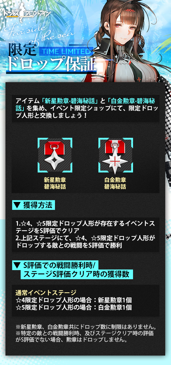 イベント「碧海秘話」における「ステージクリア報酬」、「限定ドロップ」、「限定ドロップ保証」についてのお知らせです。