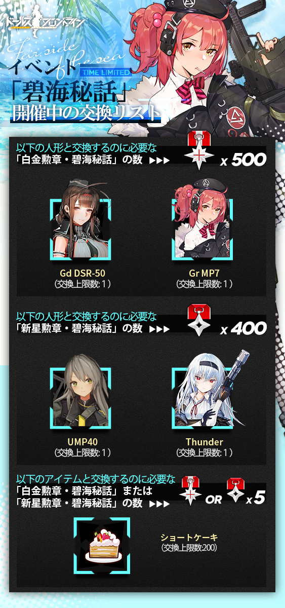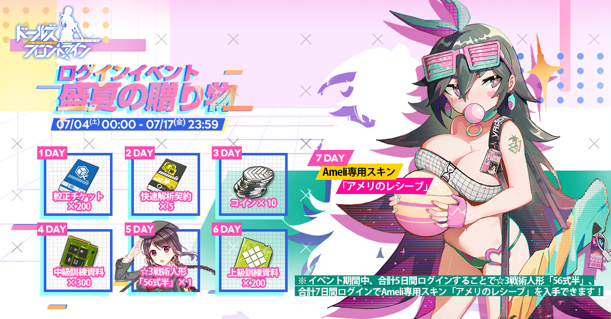 ログイン日数に応じてプレゼントが配られ、累計5日目には新人形の☆3RF「56式半」、累計7日目にはAmeli専用スキン「アメリのレシーブ」が貰えるため、ログインをお忘れなく!
