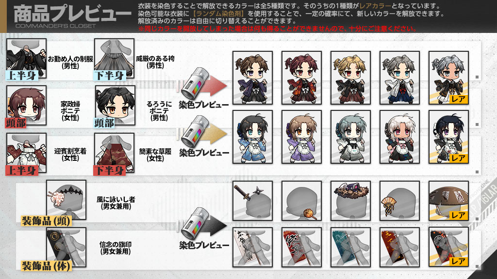 「ランダム染色剤」を使って衣装の色やバリエーションを増やし、オシャレを楽しんでくださいね。