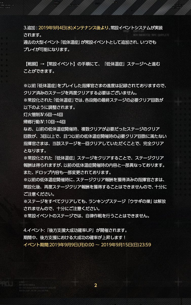 「9月4日(水)メンテナンス後」より、過去の大型イベント『低体温症』を常設化し、いつでもプレイが可能になります。