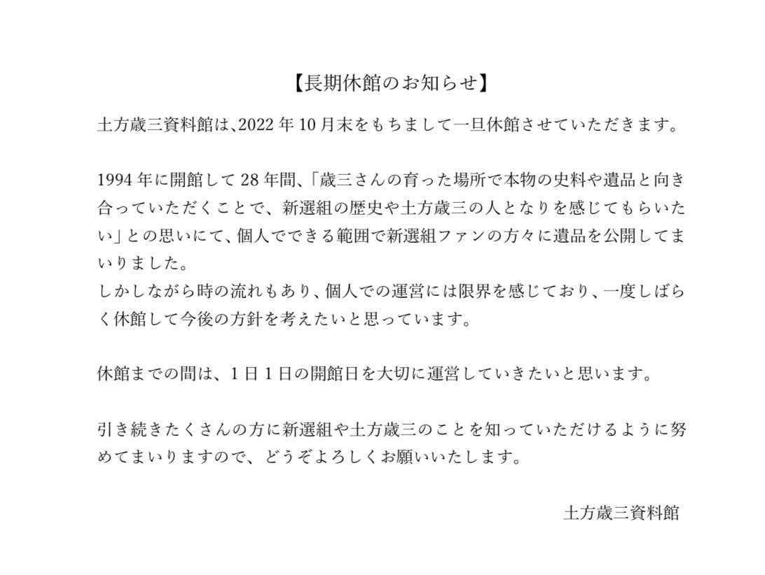 歳三の生家・土方歳三資料館は、2日間限定で臨時開館いたします
