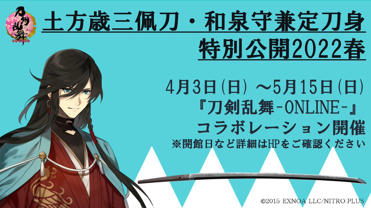 4/3(日)~5/15(日)、当館で #土方歳三 佩刀・ #和泉守兼定 が展示されることを記念し、「#刀剣乱舞-ONLINE-」とコラボが決定しました。