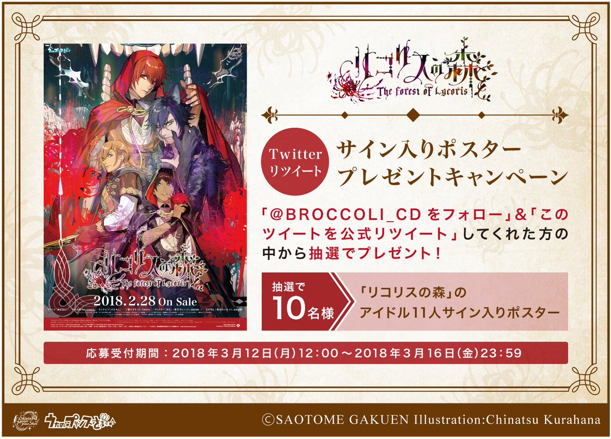 うたの☆プリンスさまっ♪Shining Masterpiece Show「リコリスの森」Twitterリツイートキャンペーンを開催! 当アカウントをフォロー&リツイートして「リコリスの森」アイドル11人サイン入りポスターを当てよう!応募受付は2018年3月16日(金)23:59まで utapri.com/sp/sms/lycoris…