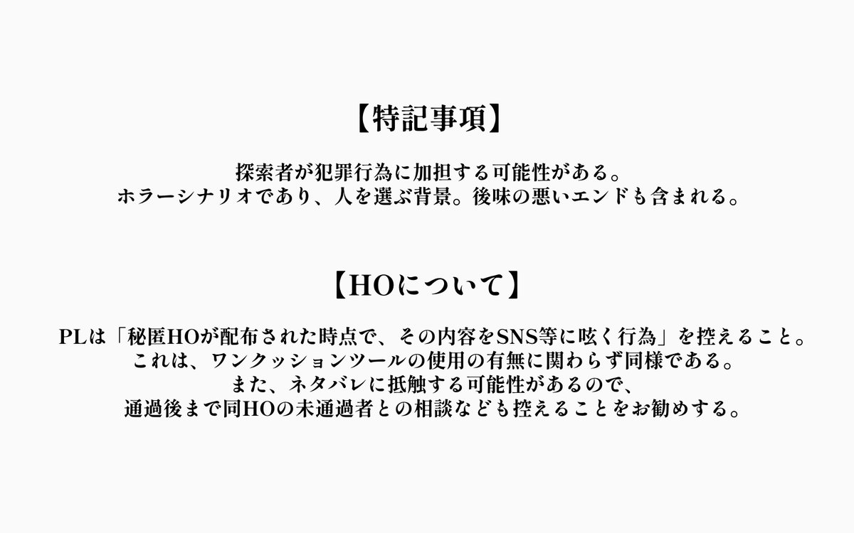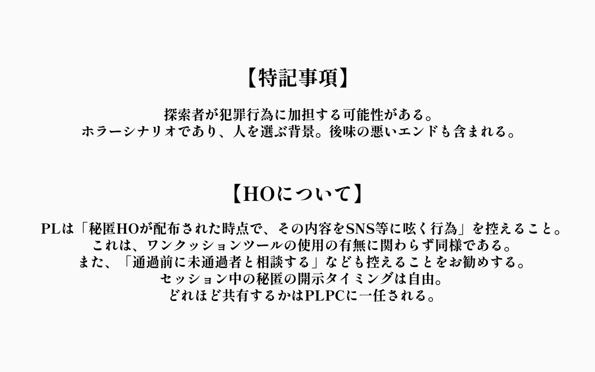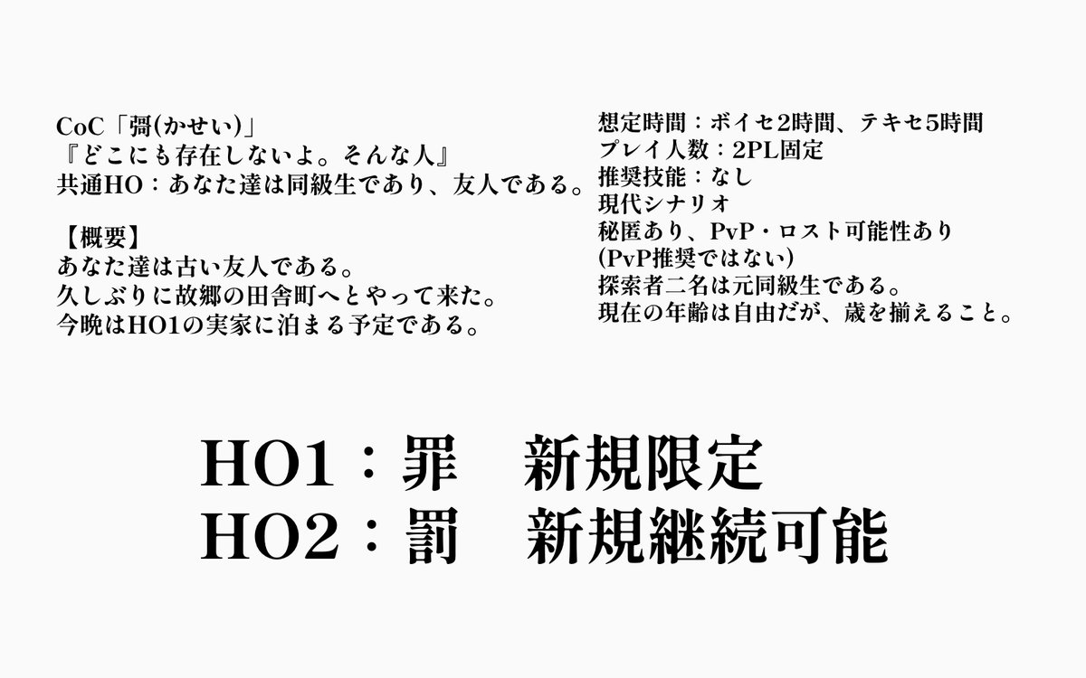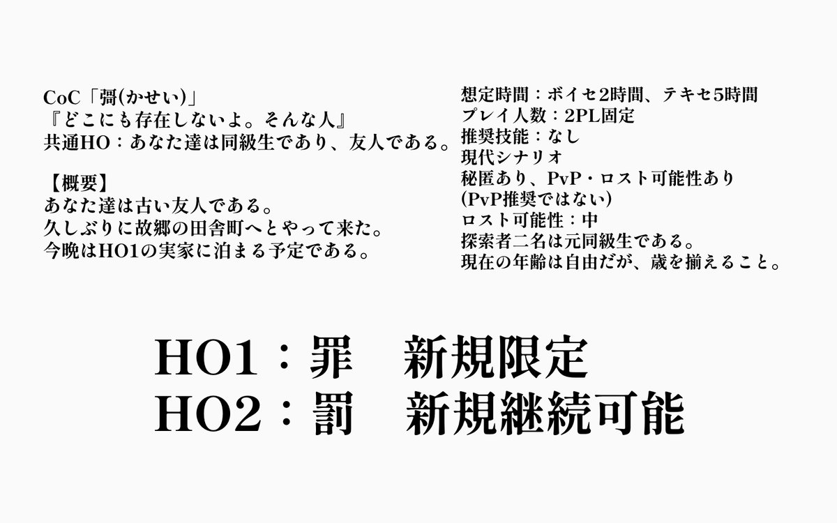 幽霊文字、書(しょ)、廃工場の秘密基地、不在の証明、犯罪行為がモチーフの里帰り秘匿2PL。一晩で終わります。 #CoC彁