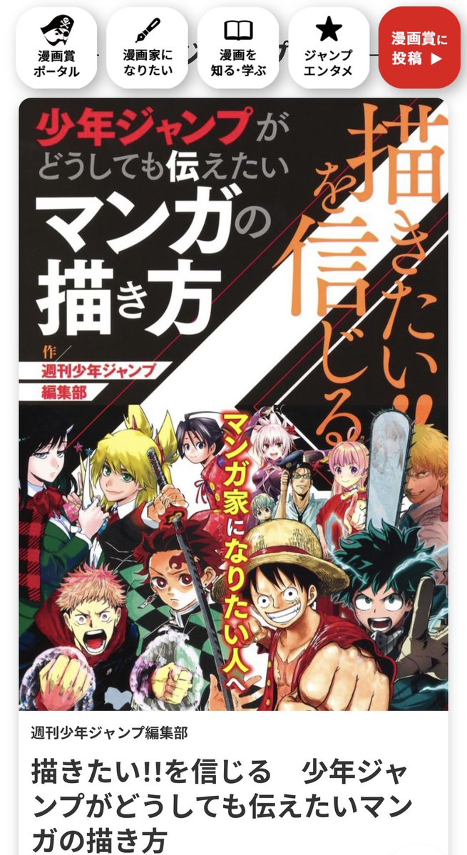 少年ジャンプ漫画賞ポータルサイトで「描きたい!!を信じる 少年ジャンプがどうしても伝えたいマンガの描き方」の第1章がまるごと試し読みできるようになりました! 累計8万7千部突破と異例の売り上げ更新中の本書、気になっていた方はぜひ読んでみてください!