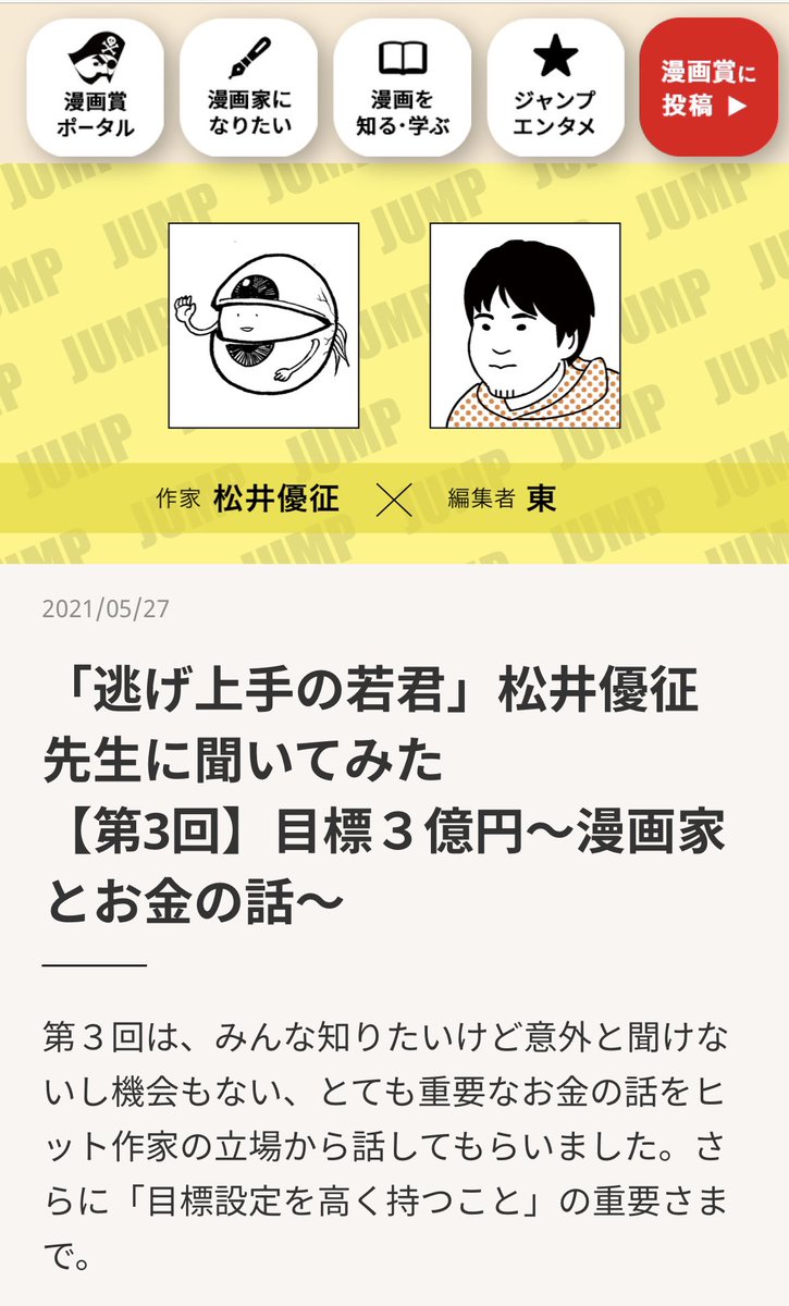 ジャンプ漫画賞ポータルサイトの松井優征先生インタビュー、第3回はずばり知りたいけど情報があまりない「お金の話」。目標3億円とは?元手がない新人時代の過ごし方は?など、ジャンプで大ヒットを経験した作家さんの立場から語っていただきました。