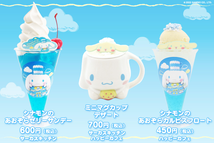 シナモロール20周年を記念して、3/5より「シナモンのあおぞらクリームシチューライス」、「シナモンのあおぞらゼリーサンデー」など、とってもかわいいメニューが登場!