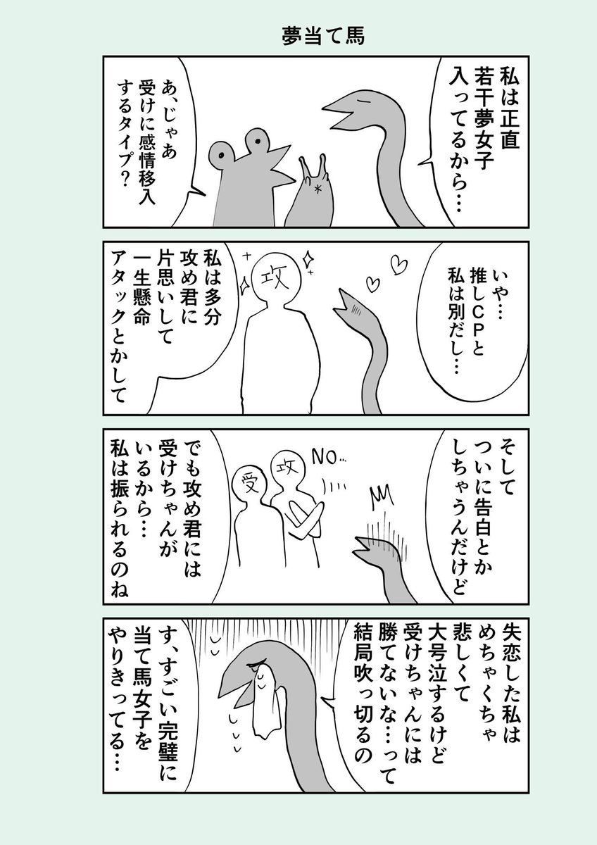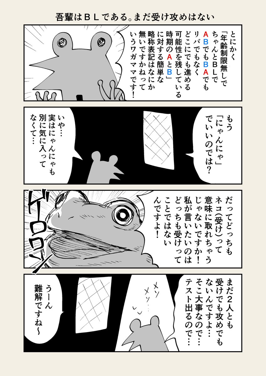 今日の難解のカエル、「これからABにもBAにもなれる可能性があってほしい」という思考がBLそのものなのにその思考知らずにカエルの創作読むと表面上ブロマンス、という似非ブロマンスなので厄介…ブロマンスとBLは違うので…ブロマンスはCPになってはいけないので…