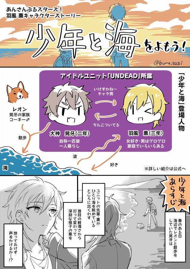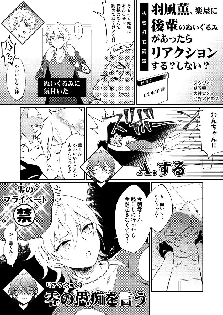 今日インテで配ってた無配です。後輩大好きな未来羽風くんとぶくぬい(大)とUNDEADの何が出てもいい人向けの漫画