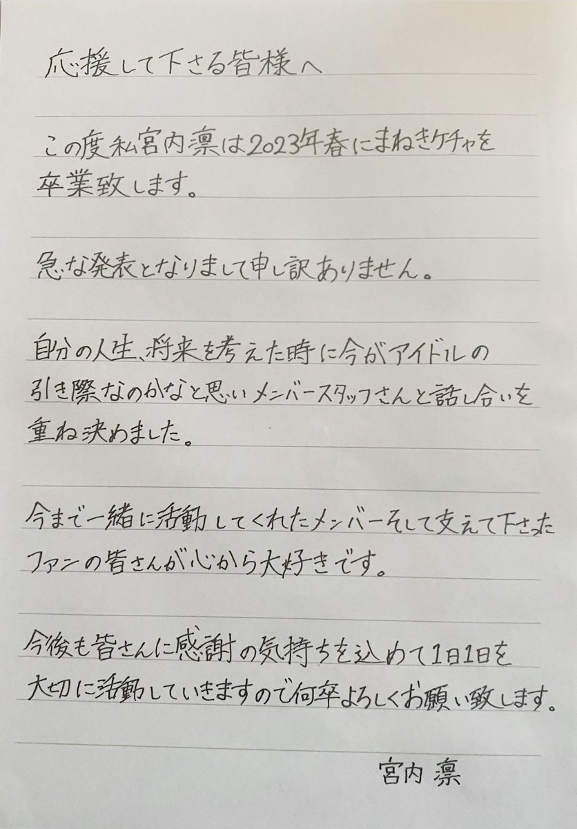 いつも応援して下さる皆様へ 私宮内凛は2023年春に卒業致します。 突然の発表で驚かせてしまい申し訳ありません。 卒業まで精一杯ファンの皆さんを笑顔に出来るよう頑張りますので何卒よろしくお願い致します!